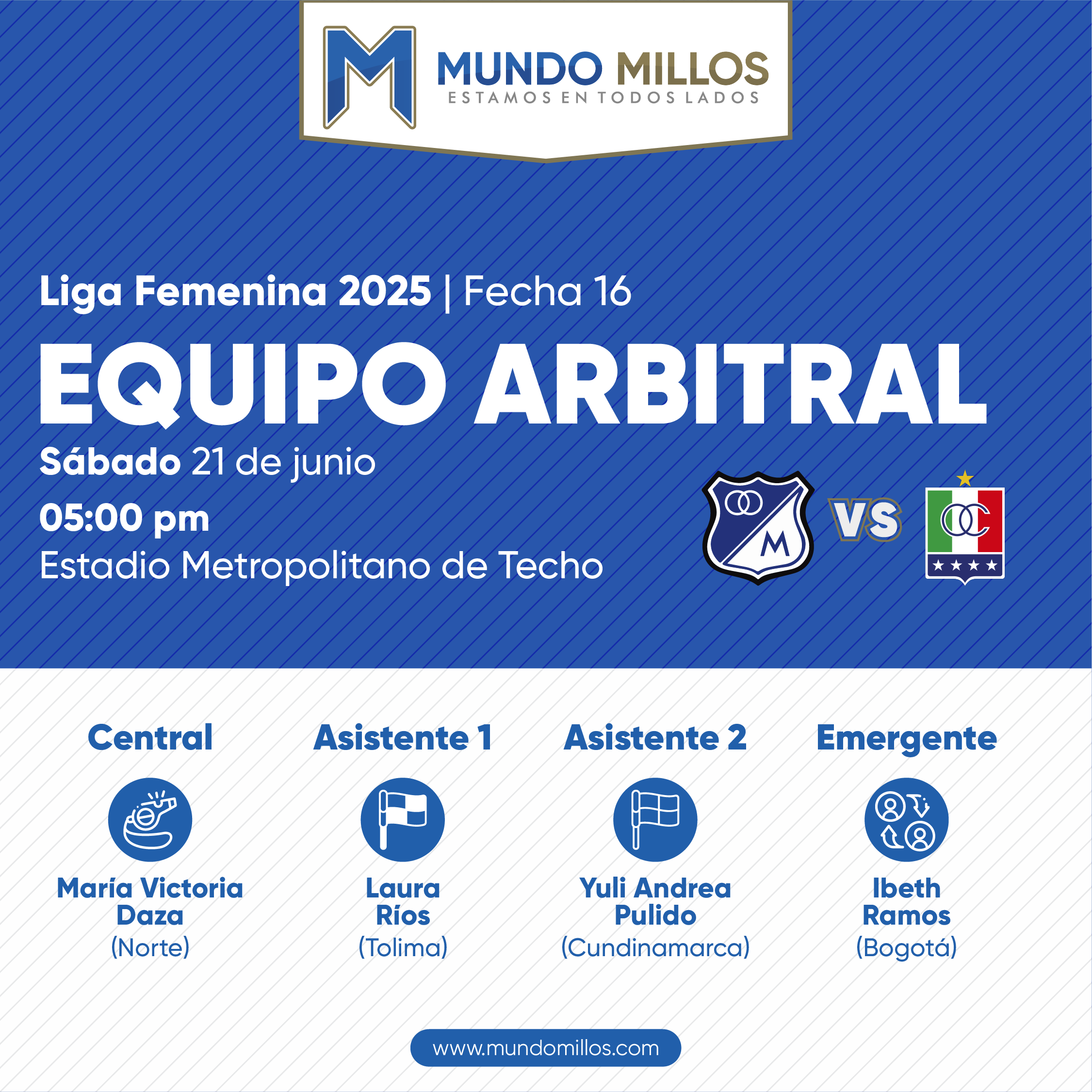 Última fecha del todos contra todos de la Liga Femenina,. Las Embajadoras se juegan su paso a los cuadrangulares frente al Once Caldas y ya está confirmado el equipo arbitral: María Victoria Daza, del colegio de Norte, será la encargada de pitar el partido entre Millonarios y las «blancas» este sábado desde las 5 pm con señal TV por los dos canales de WIN y de audio por la multitransmisión de Mundo Millos en simultánea por todas nuestras plataformas.