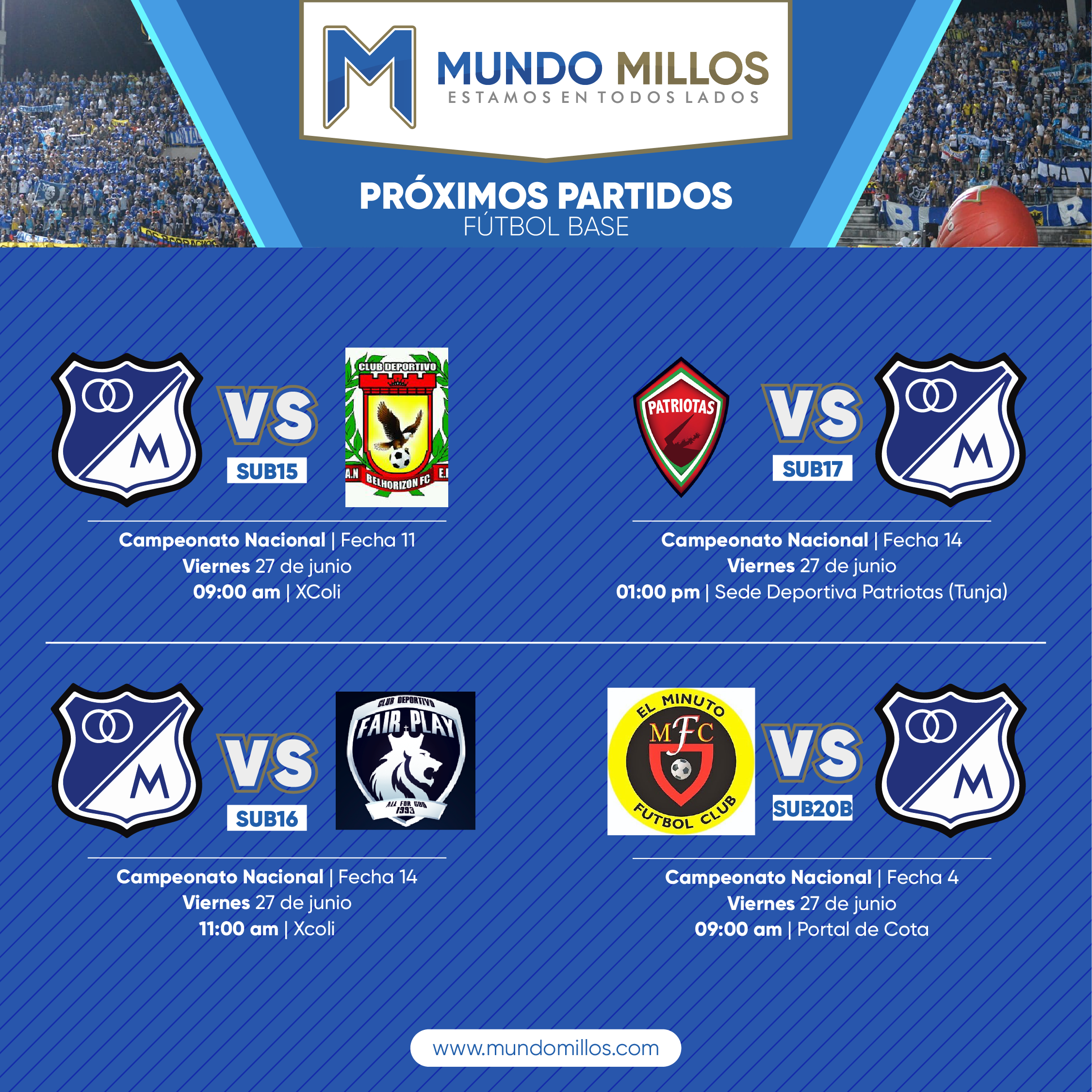 Como cada semana, MundoMillos estará junto a los equipos juveniles de Millonarios realizando el cubrimiento del fútbol base.