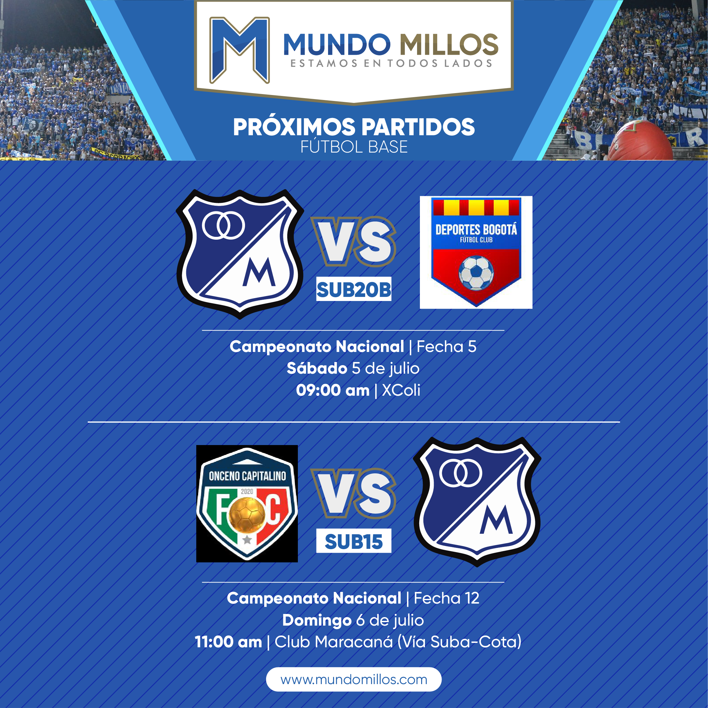 Como cada semana, MundoMillos estará junto a los equipos juveniles de Millonarios realizando el cubrimiento del fútbol base.