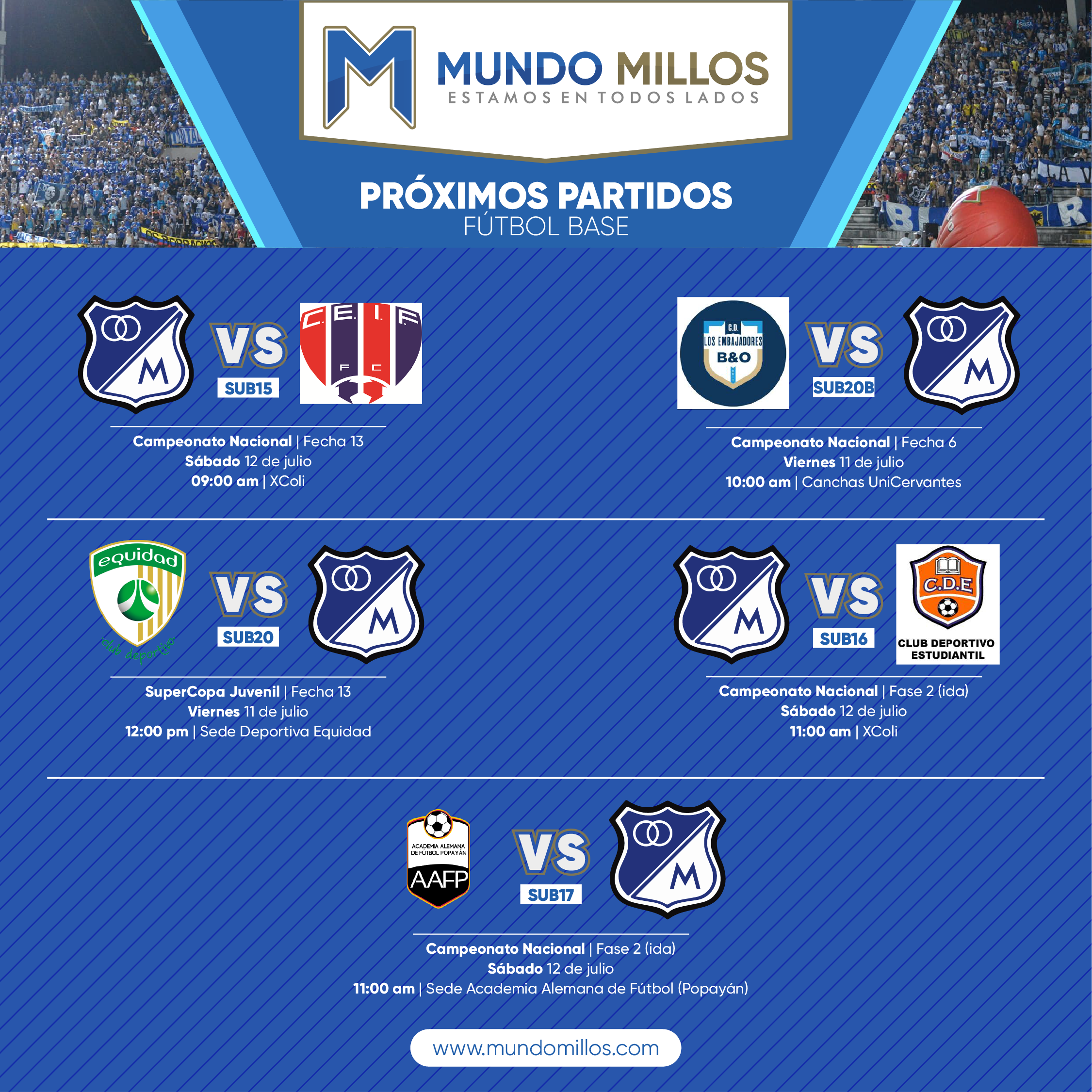 Como cada semana, MundoMillos estará junto a los equipos juveniles de Millonarios realizando el cubrimiento del fútbol base.
