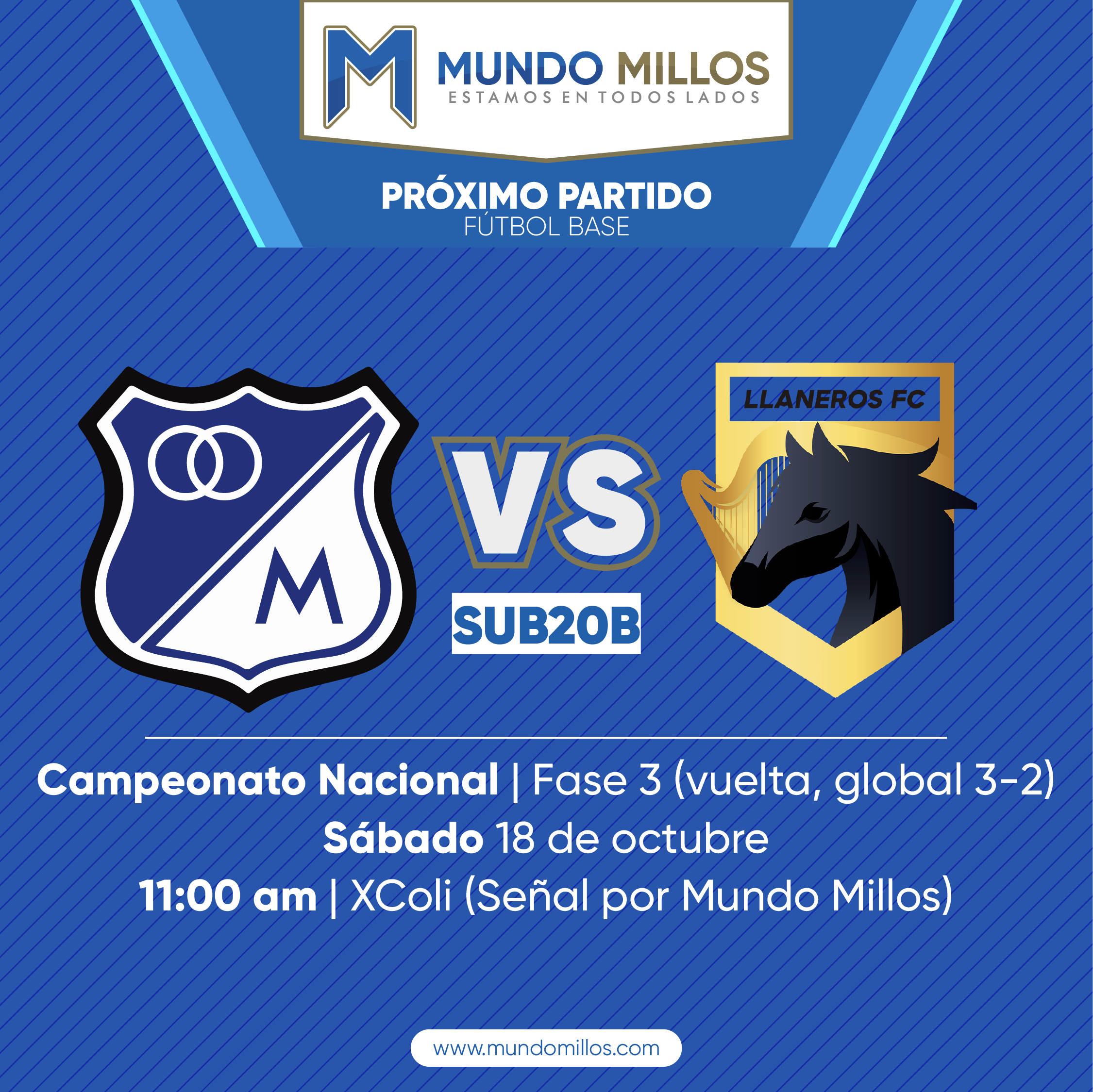 El equipo Sub20 B enfrentará este sábado a Llaneros en el partido de vuelta de la tercera fase del campeonato nacional de Difútbol en XColi desde las 11 de la mañana. Este partido será transmitido por las señales de Mundo Millos.