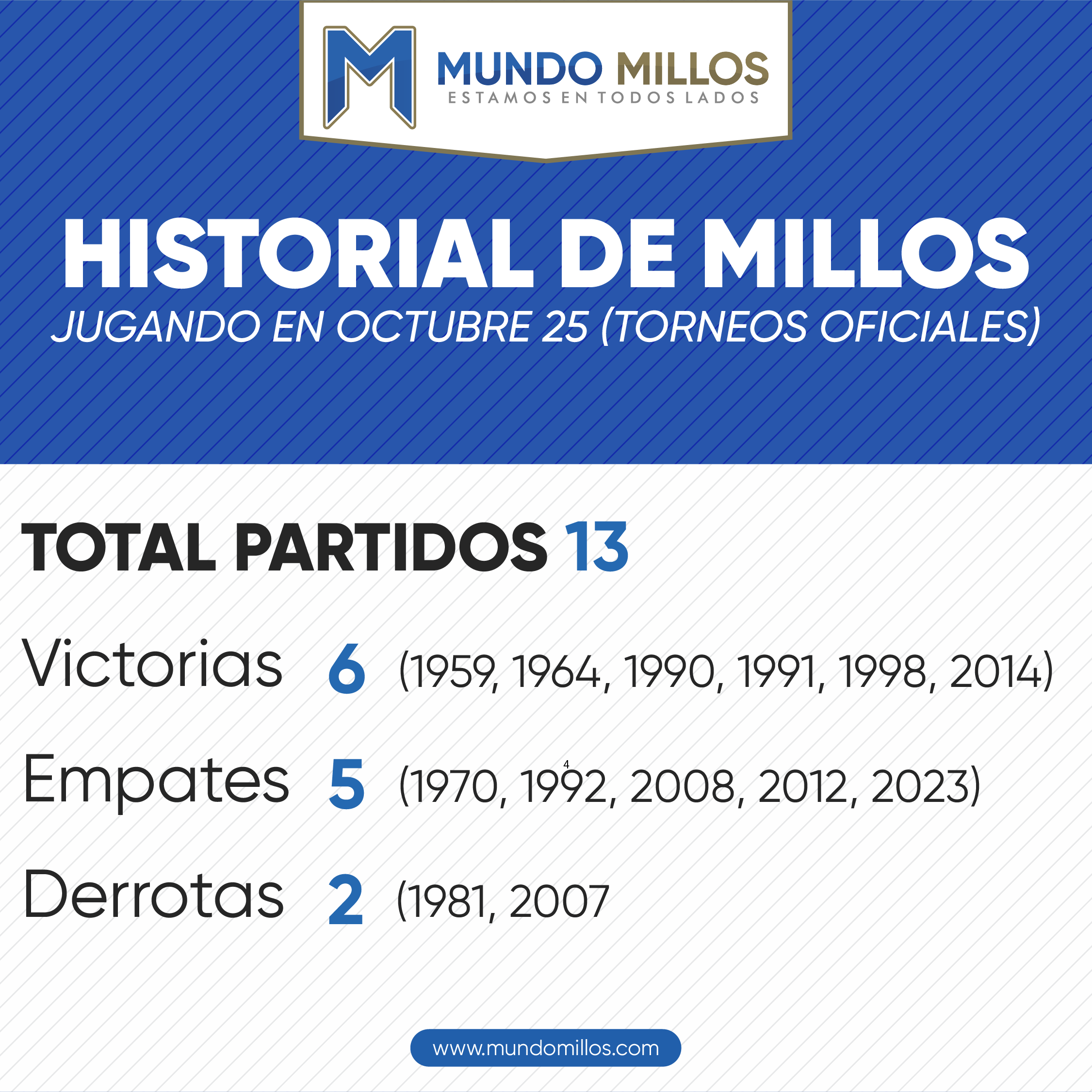 • Millonarios no pierde un 25 de octubre desde 2007, cuando cayó con una nómina suplente 0-1 frente al Bucaramanga como visitante. El equipo titular le había ganado la noche anterior por Copa Sudamericana 2-0 a Sao Paulo en Bogotá.