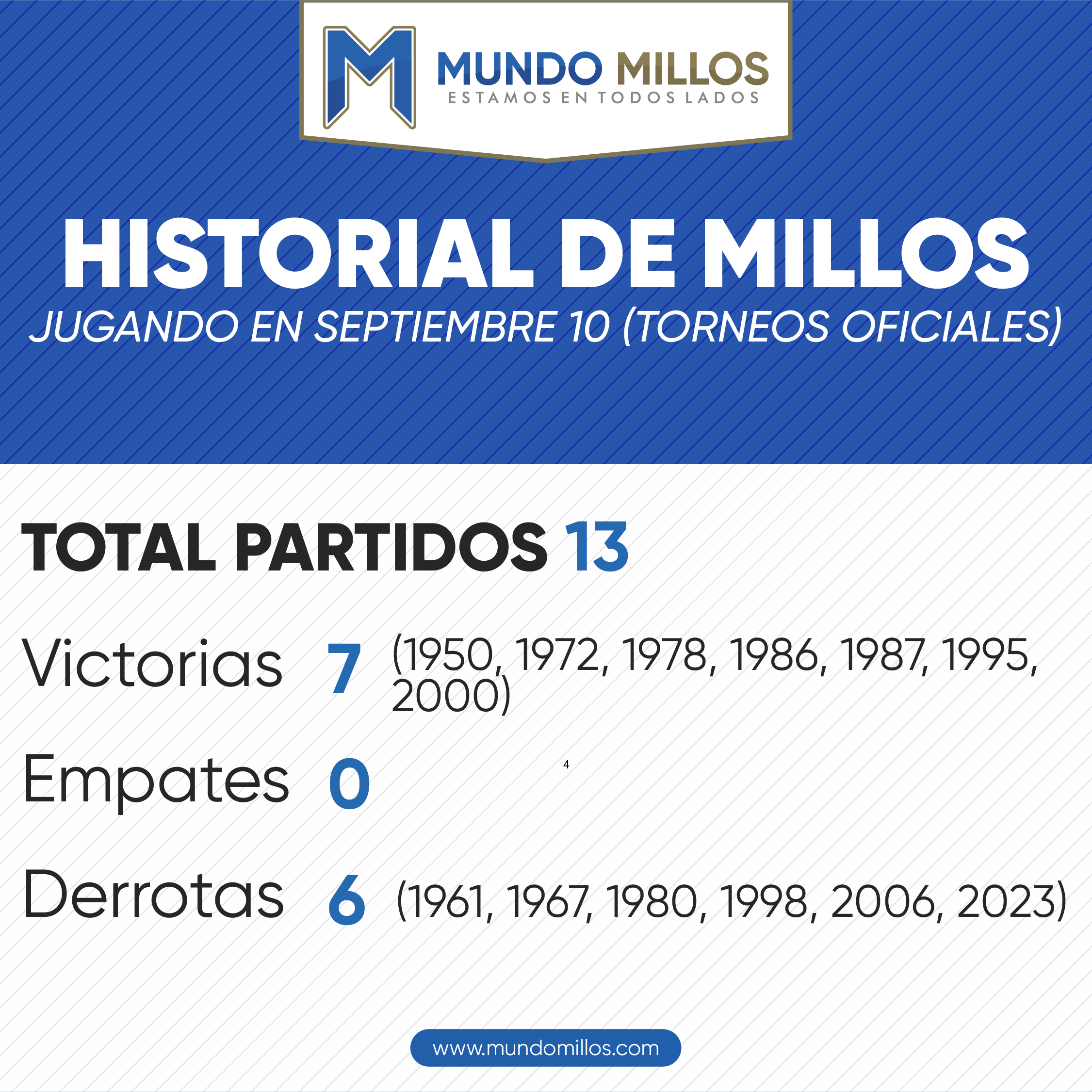 El historial de Millonarios en septiembre 10 por torneos oficiales