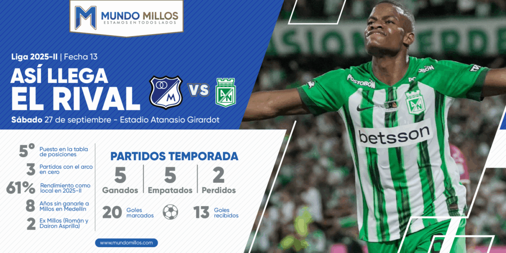 El Embajador viaja a MedellÃn a defender una muy bonita racha de ocho años sin perder como visitante frente al verde paisa en el Atanasio Girardot. Esta es la previa de Nacional vs Millonarios, que se jugará el sábado desde las 8:30 pm con señal de TV por WIN+ y en audio a través de la multitransmisión de Mundo Millos en simultánea por todas nuestras plataformas.