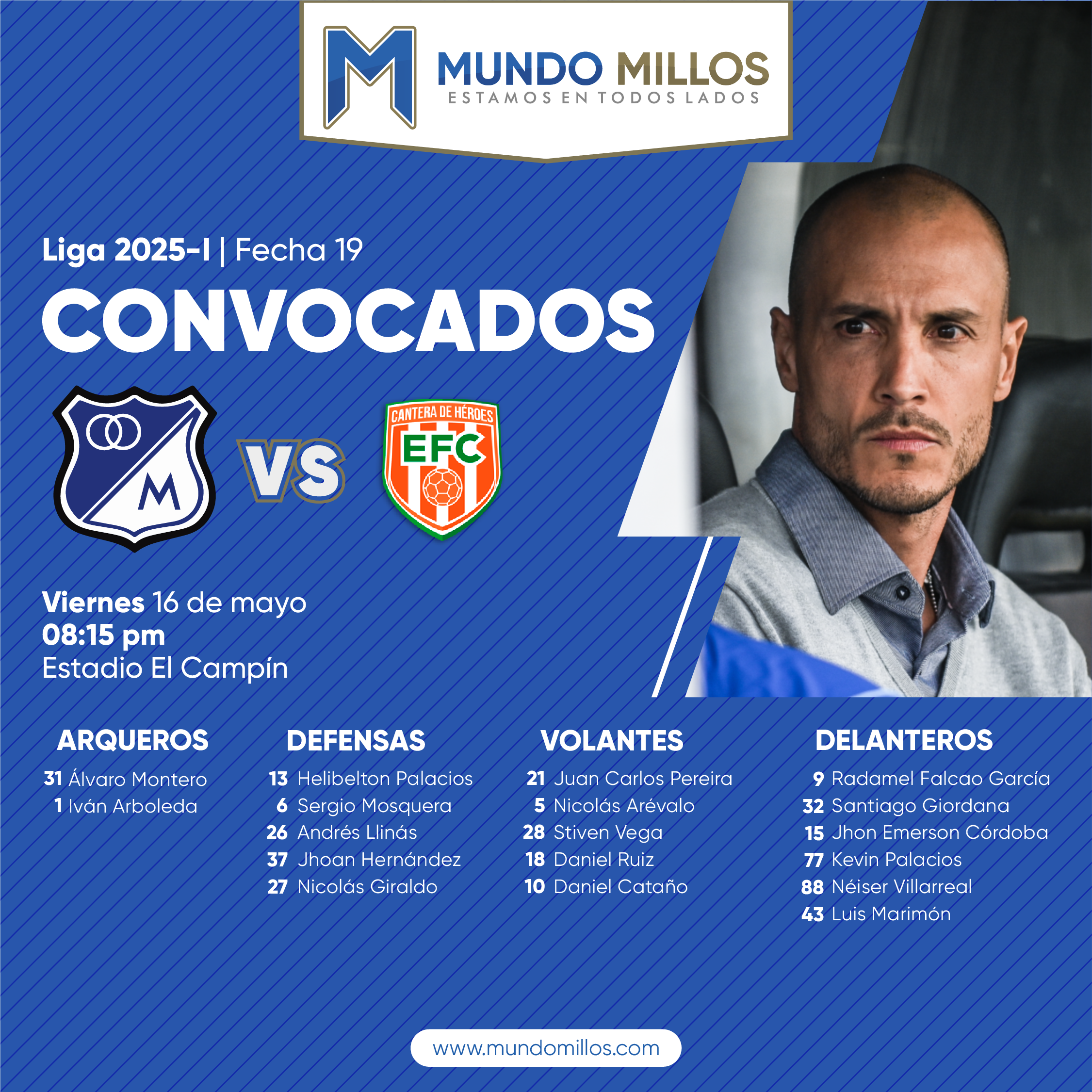El esperado regreso de Radamel Falcao GarcÃa es la novedad más importante en la convocatoria de Millonarios para su partido de la penúltima fecha del todos contra todos del Apertura 2025 este viernes en la noche frente al Envigado.
