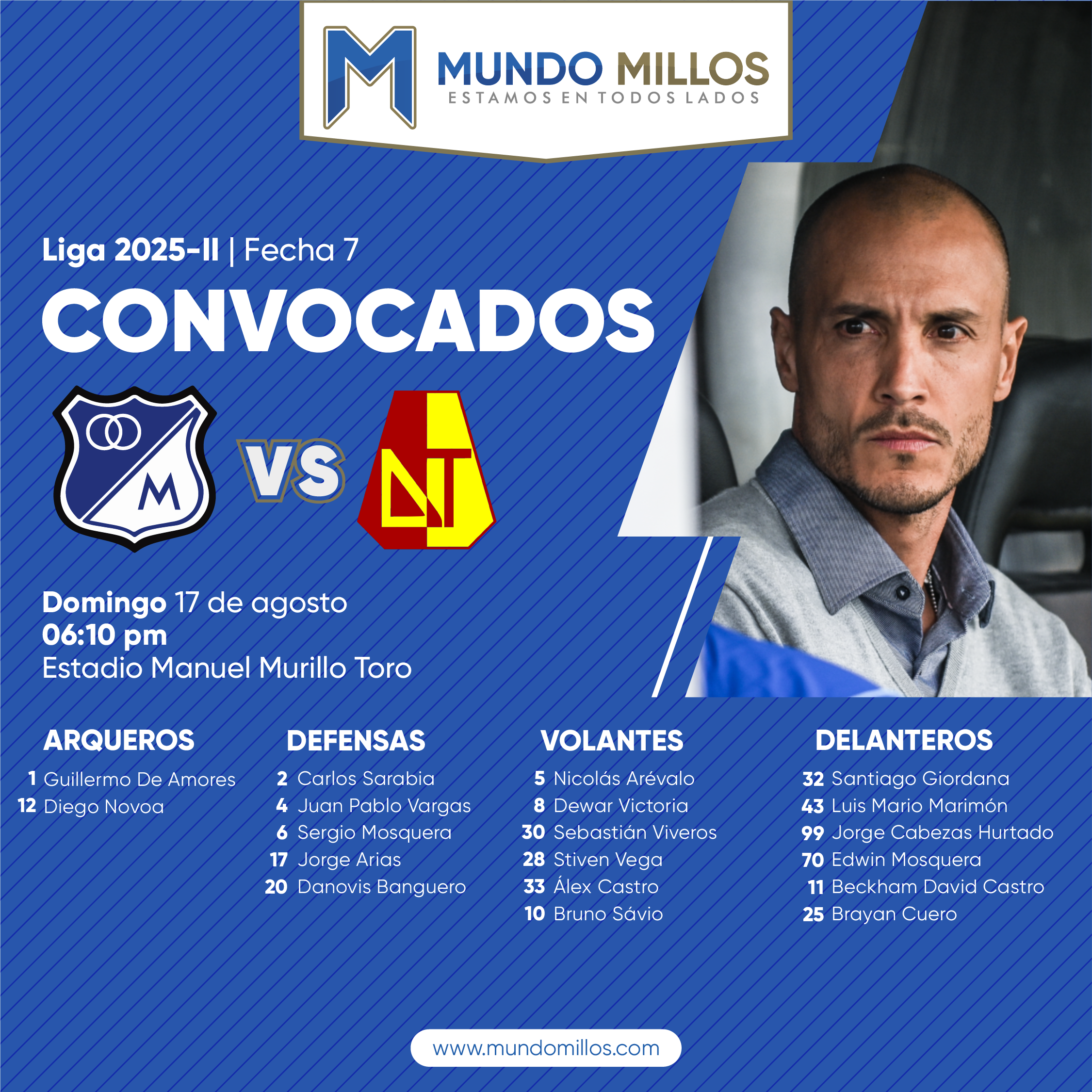 Carlos Sarabia y Sergio Mosquera son las novedades en la lista de convocados de Millonarios para su partido frente al Deportes Tolima por la séptima fecha del todos contra todos del Finalización 2025 en el estadio Manuel Murillo Toro de Ibagué.
