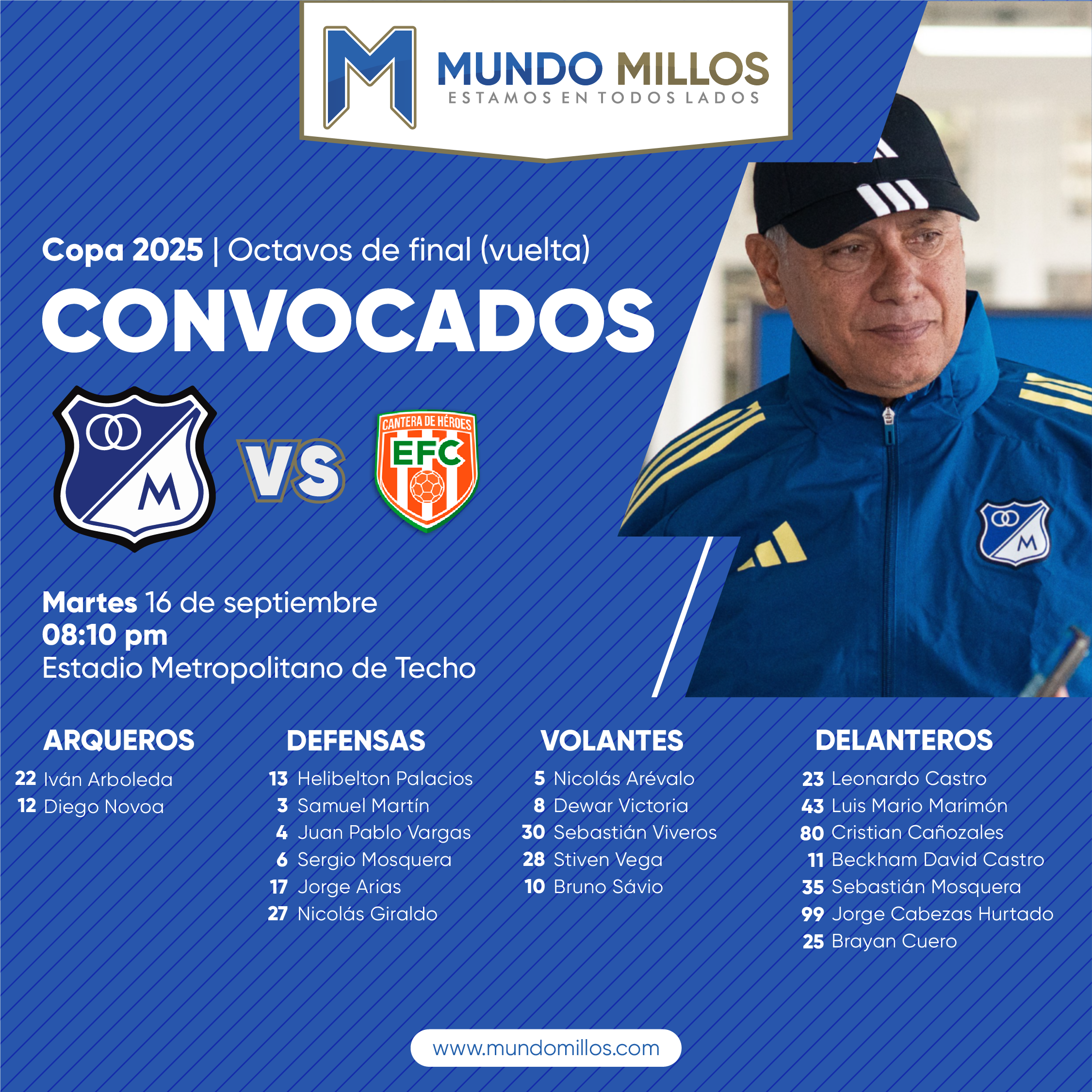 La convocatoria muestra también el regreso de Nicolás Giraldo en lugar de Jhoan Hernández y la presencia del canterano Sebastián Mosquera para cumplir con la regla de los dos Sub20, el que sale es Edwin Mosquera.